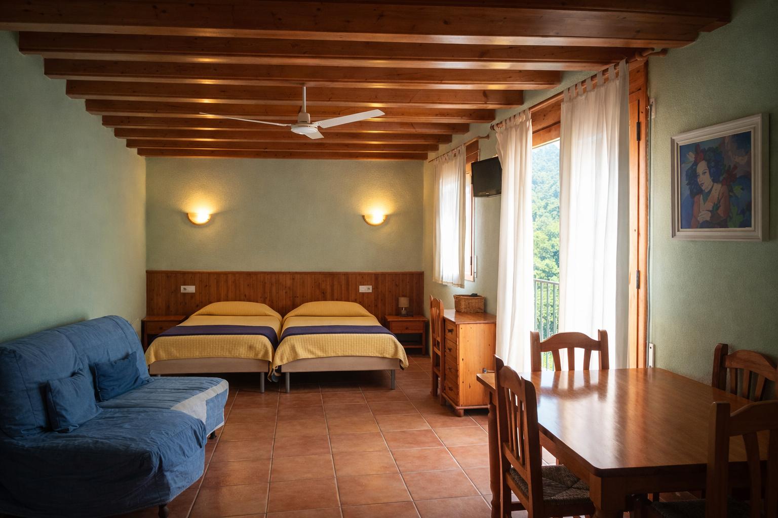 Habitació funcional amb dos llits individuals, amb l'opció d'afegir-hi un llits supletori. Perfecta per a amics o familiars. Capacitat màxima: 3 persones.